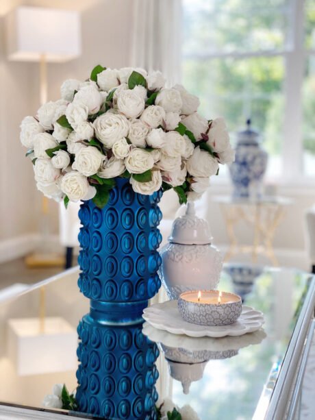English White Roses in Blue Textured Vase